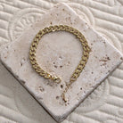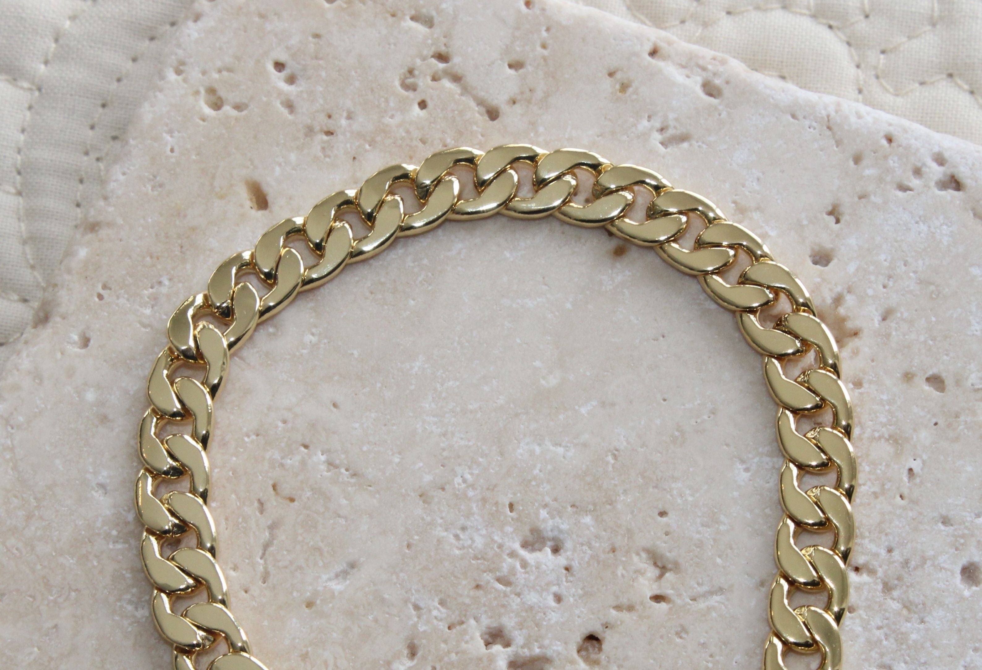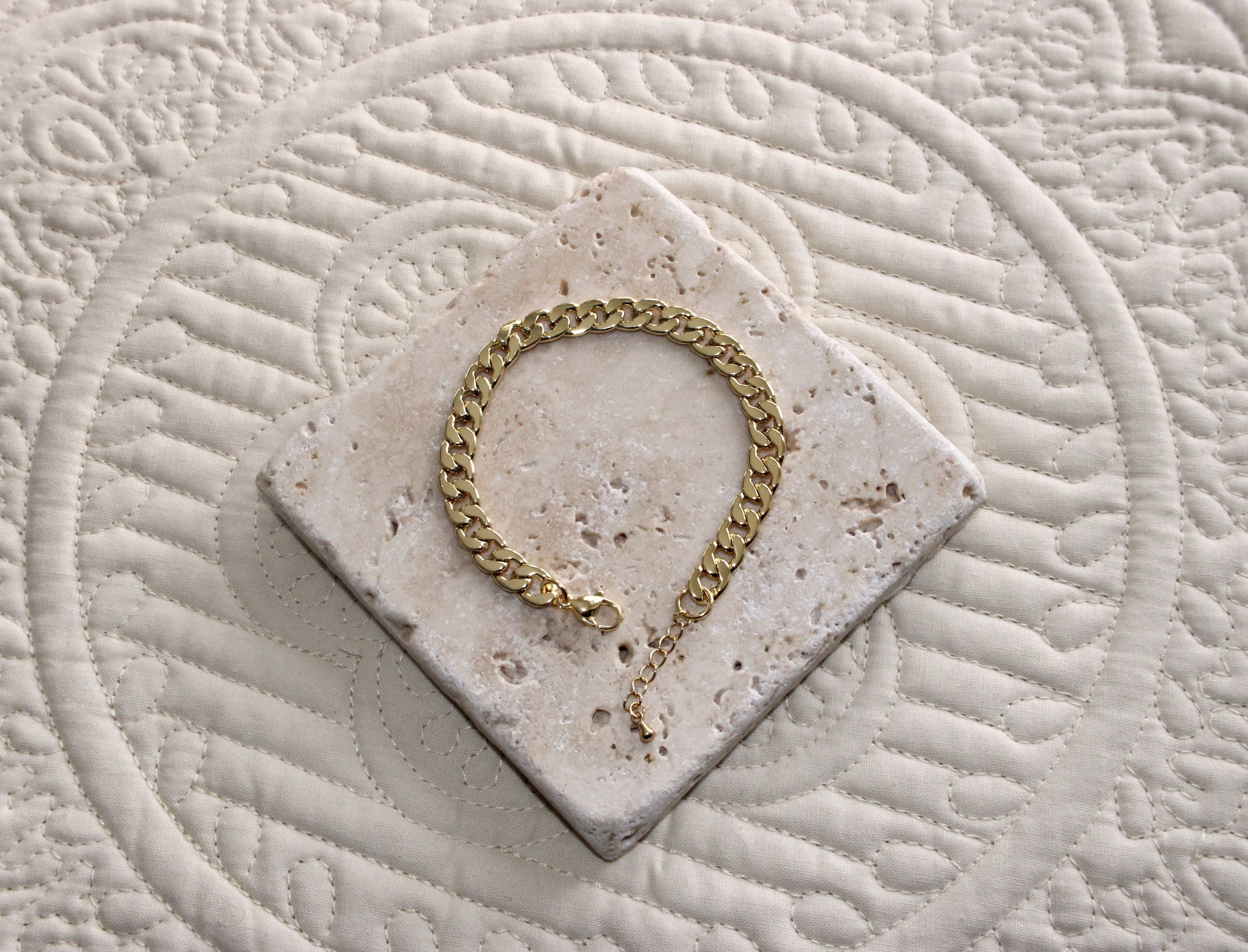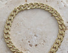 A gold-plated 7mm wide link bracelet featuring a chunky, high-polish finish for a strong, statement look. Designed with a secure lobster clasp and adjustable 1 inch extender for a comfortable fit, this piece adds confident edge whether worn solo or stacked.