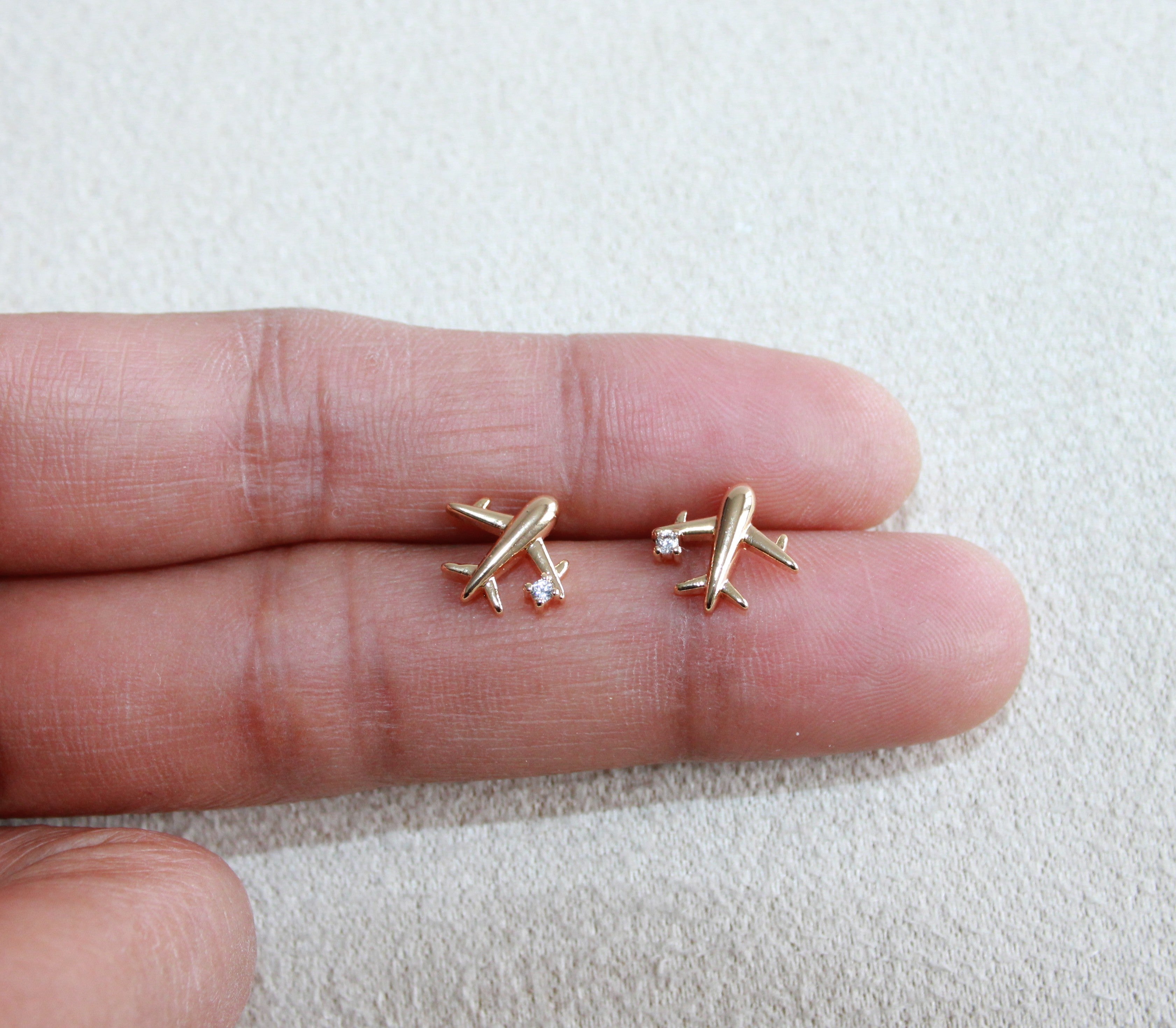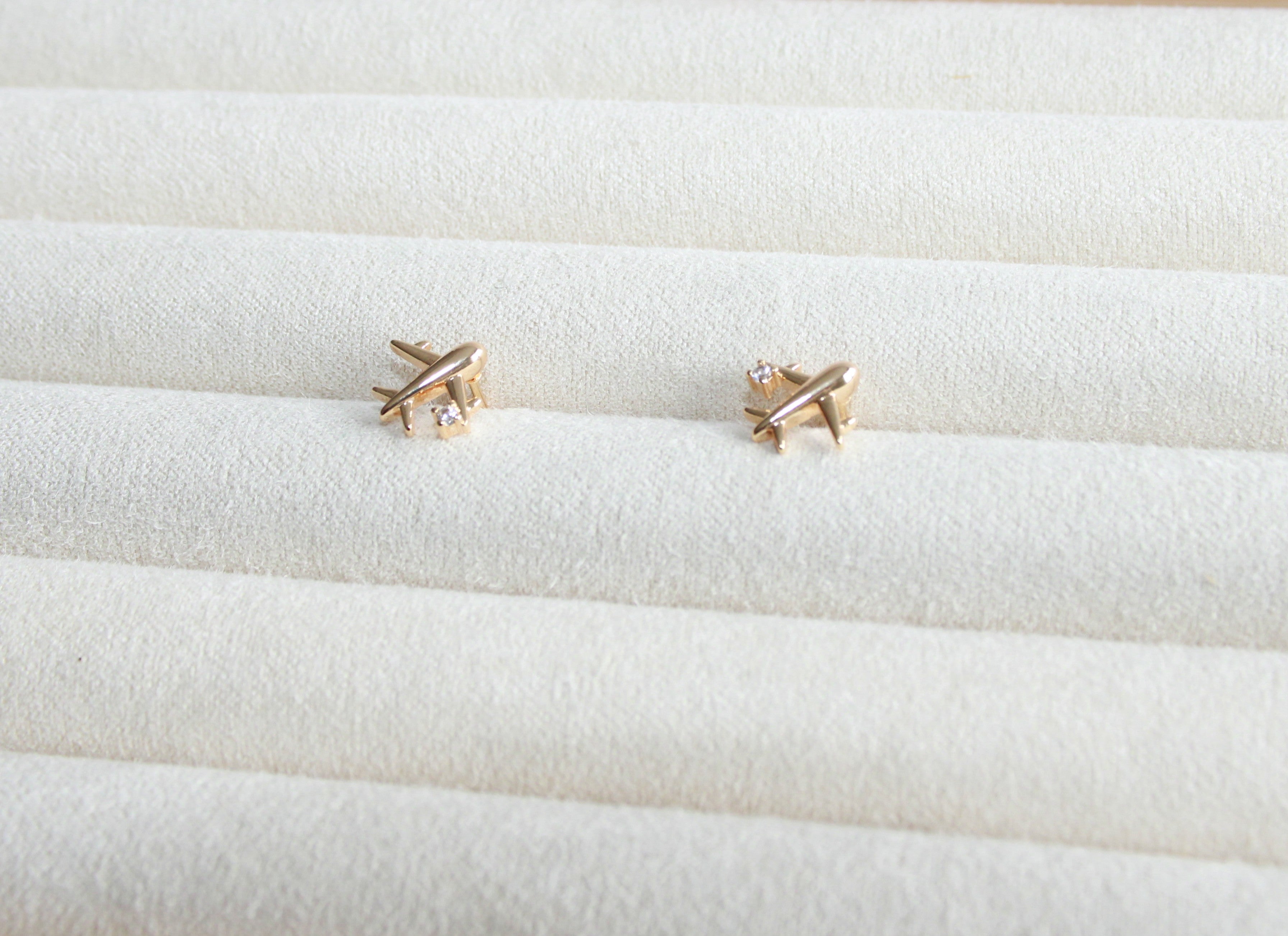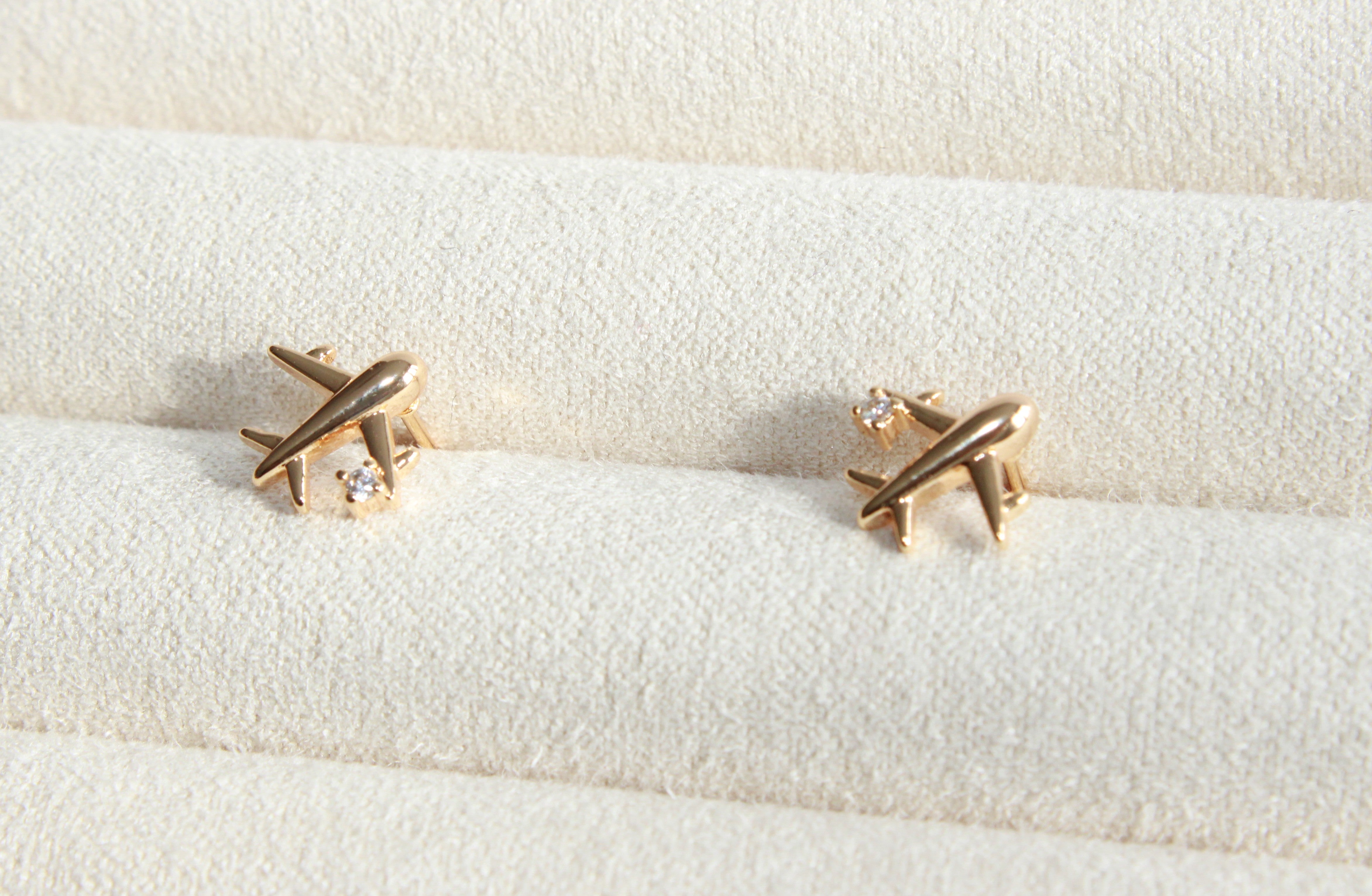 Mini airplane CZ stud earring, gold-plated for all-day wear. Lightweight and elegant, they add a subtle touch of sophistication to any outfit while keeping your ears happy.