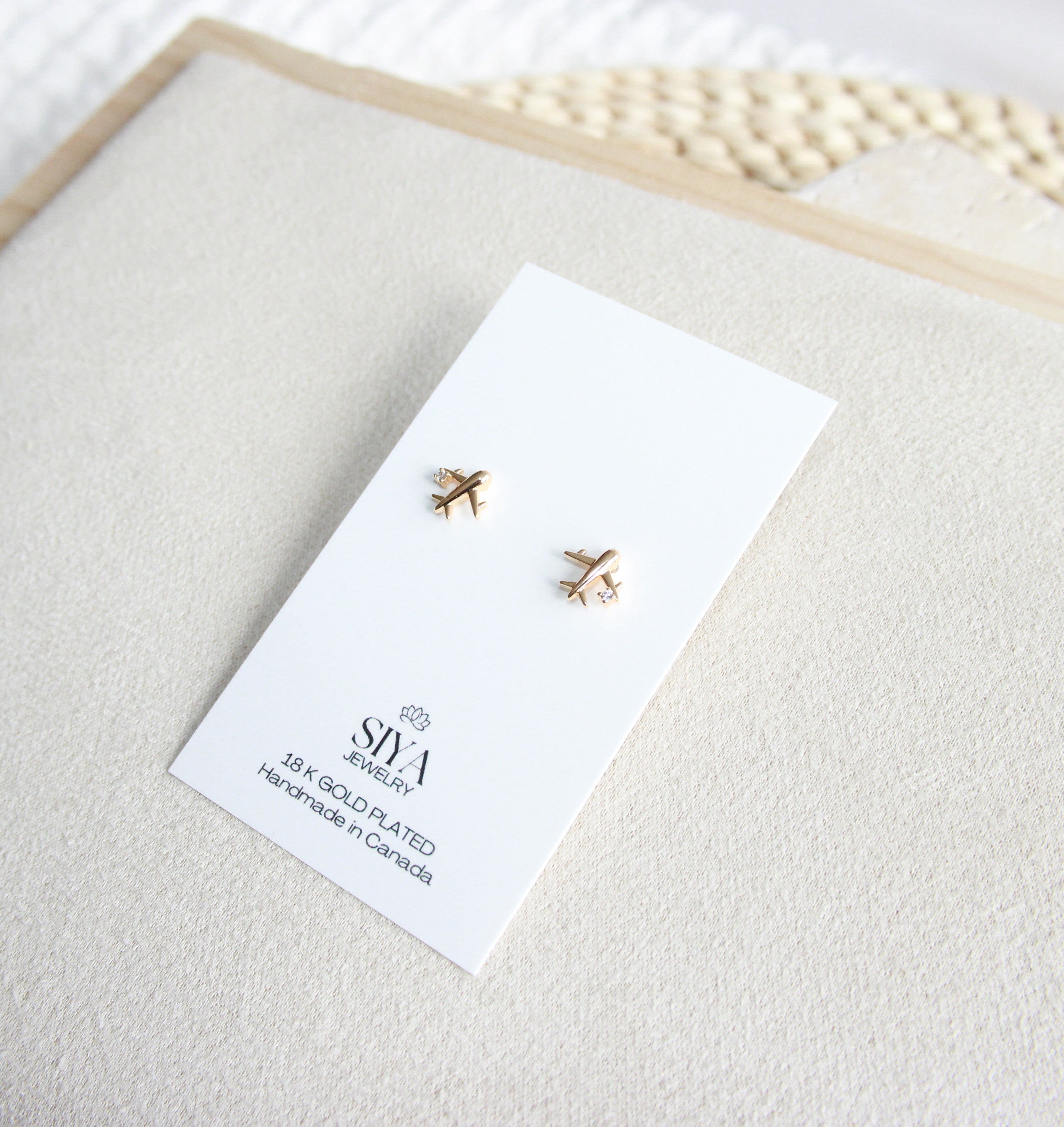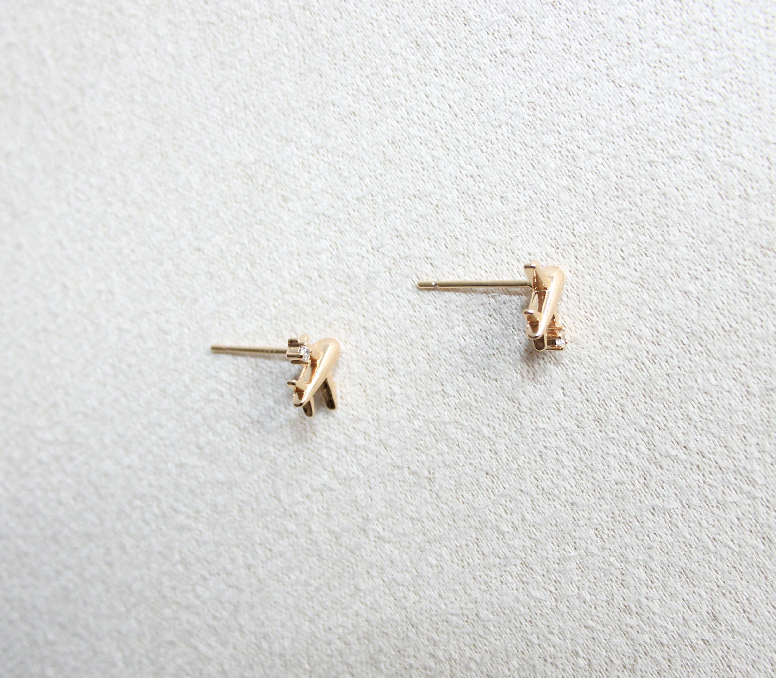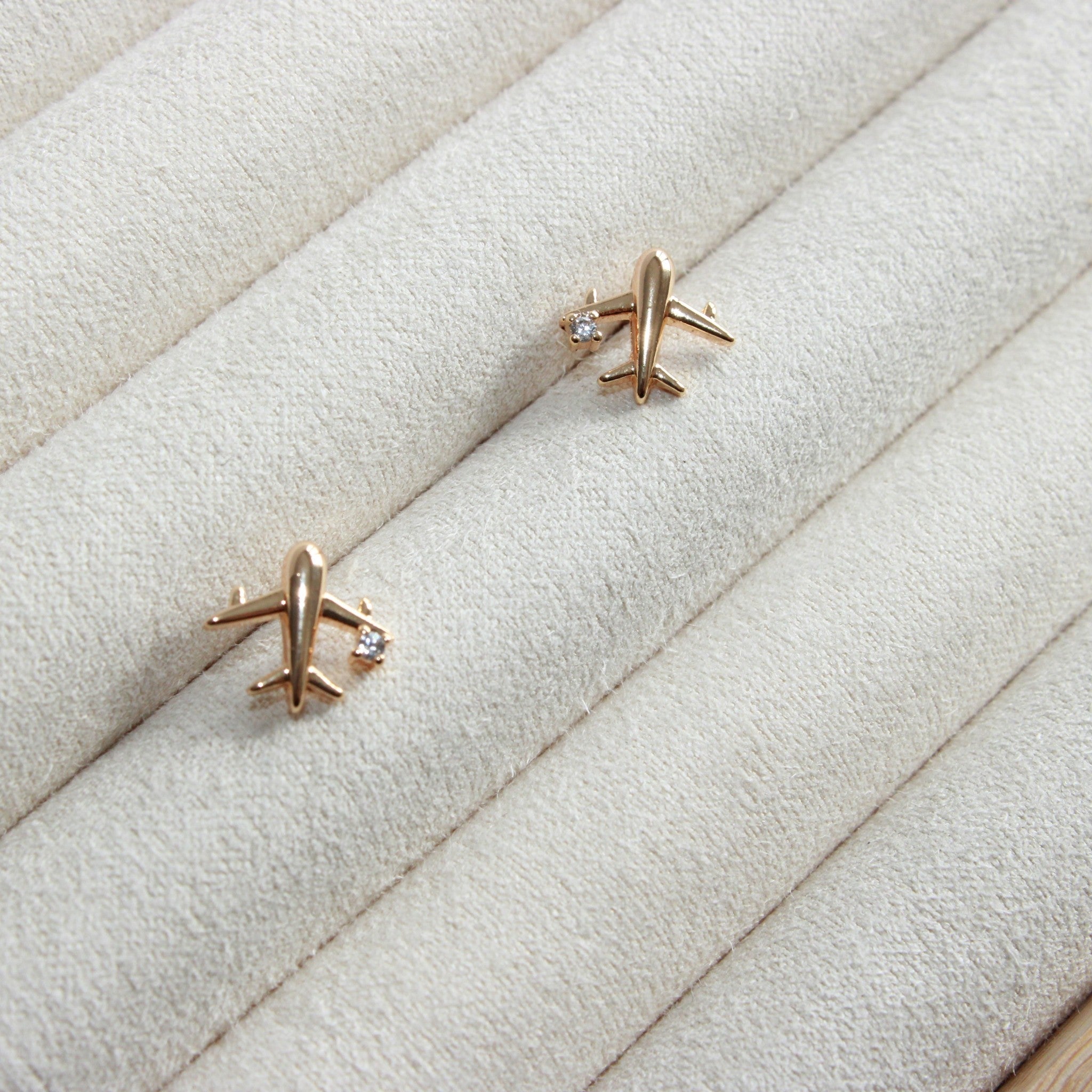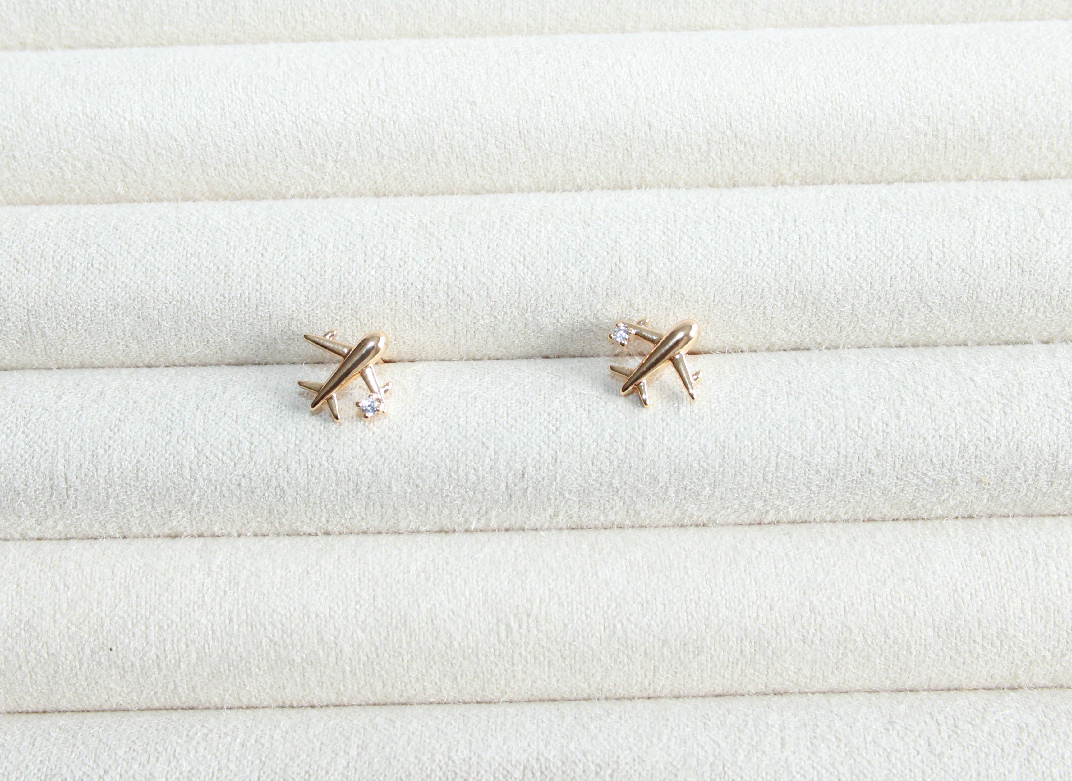 Mini airplane CZ stud earring, gold-plated for all-day wear. Lightweight and elegant, they add a subtle touch of sophistication to any outfit while keeping your ears happy.