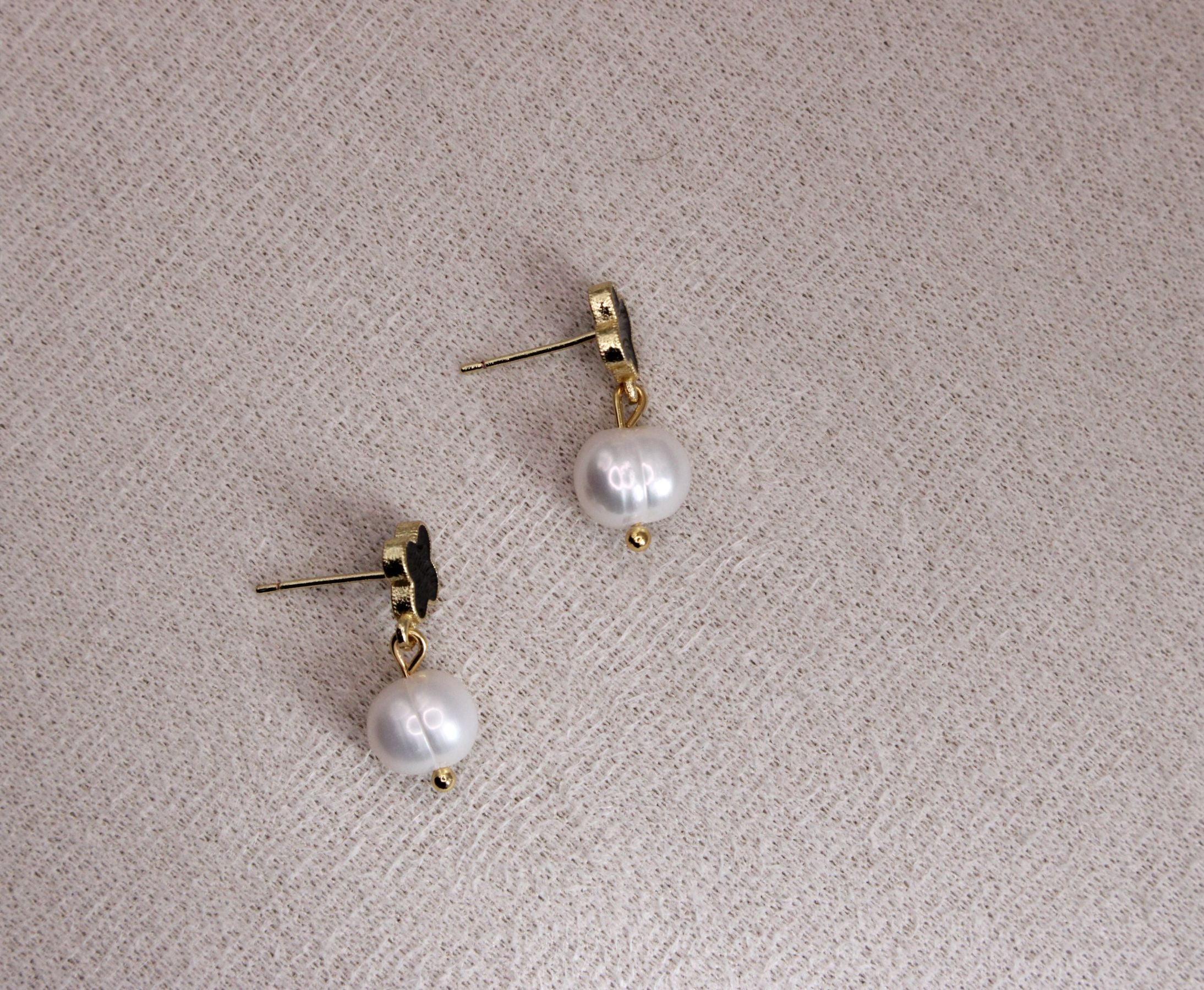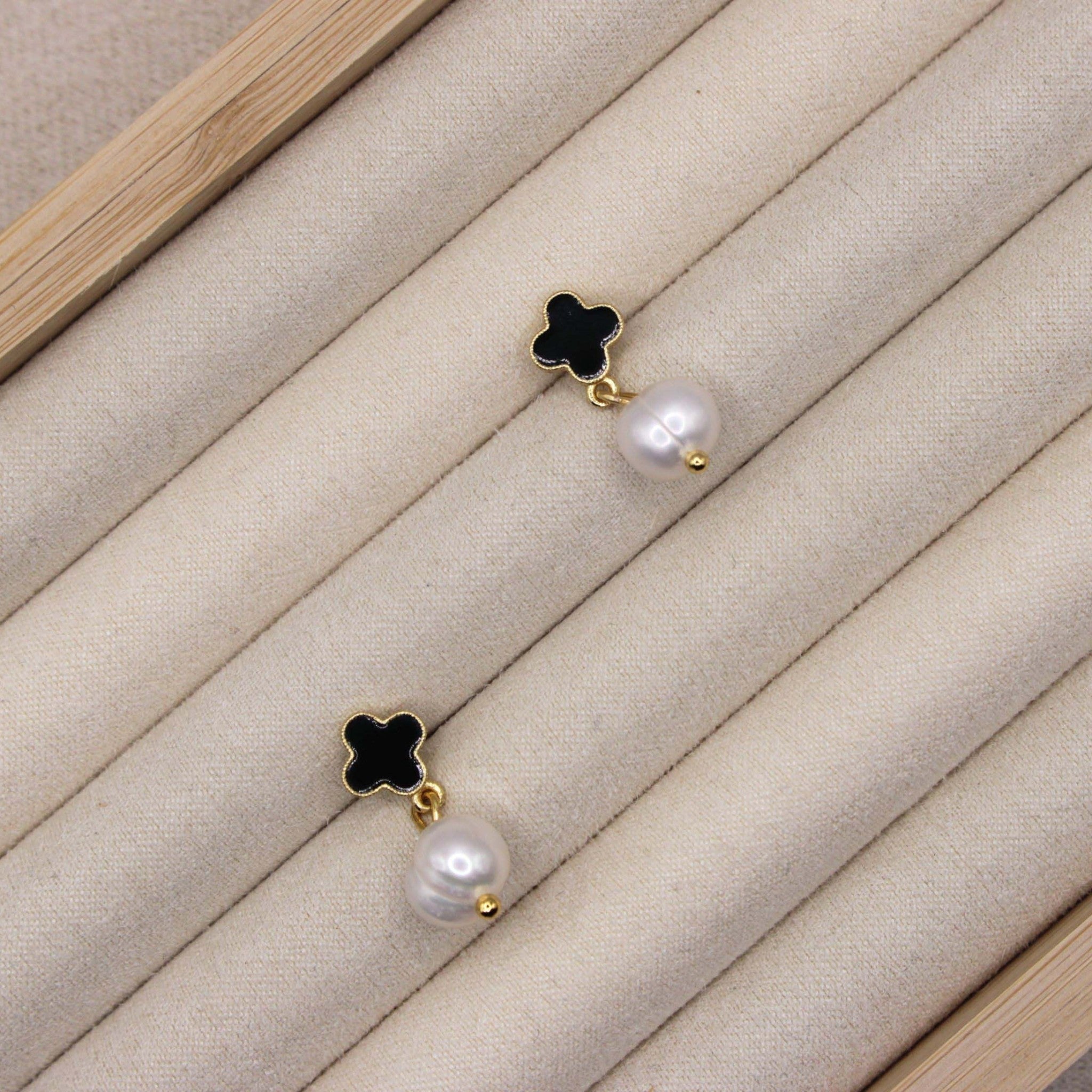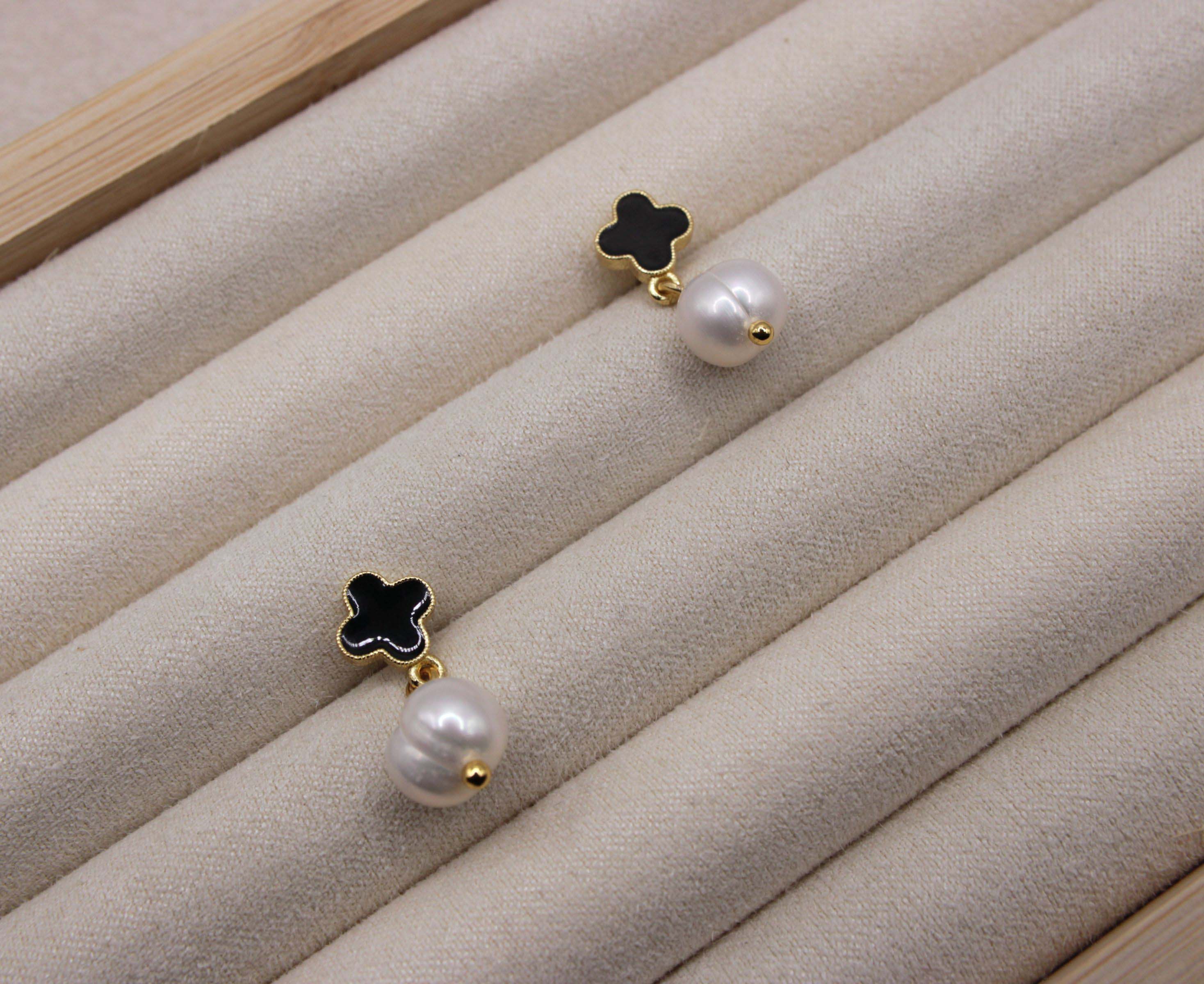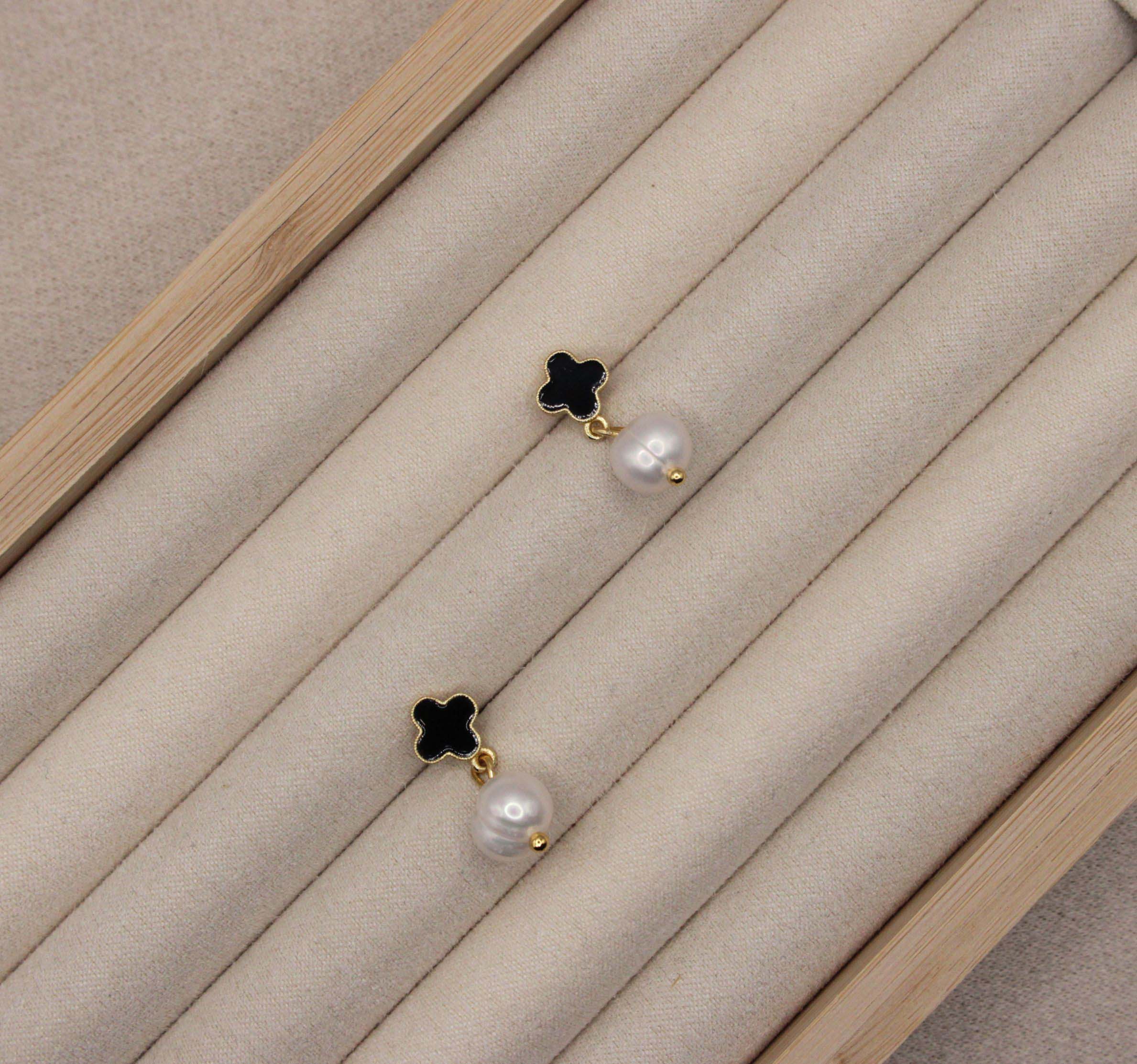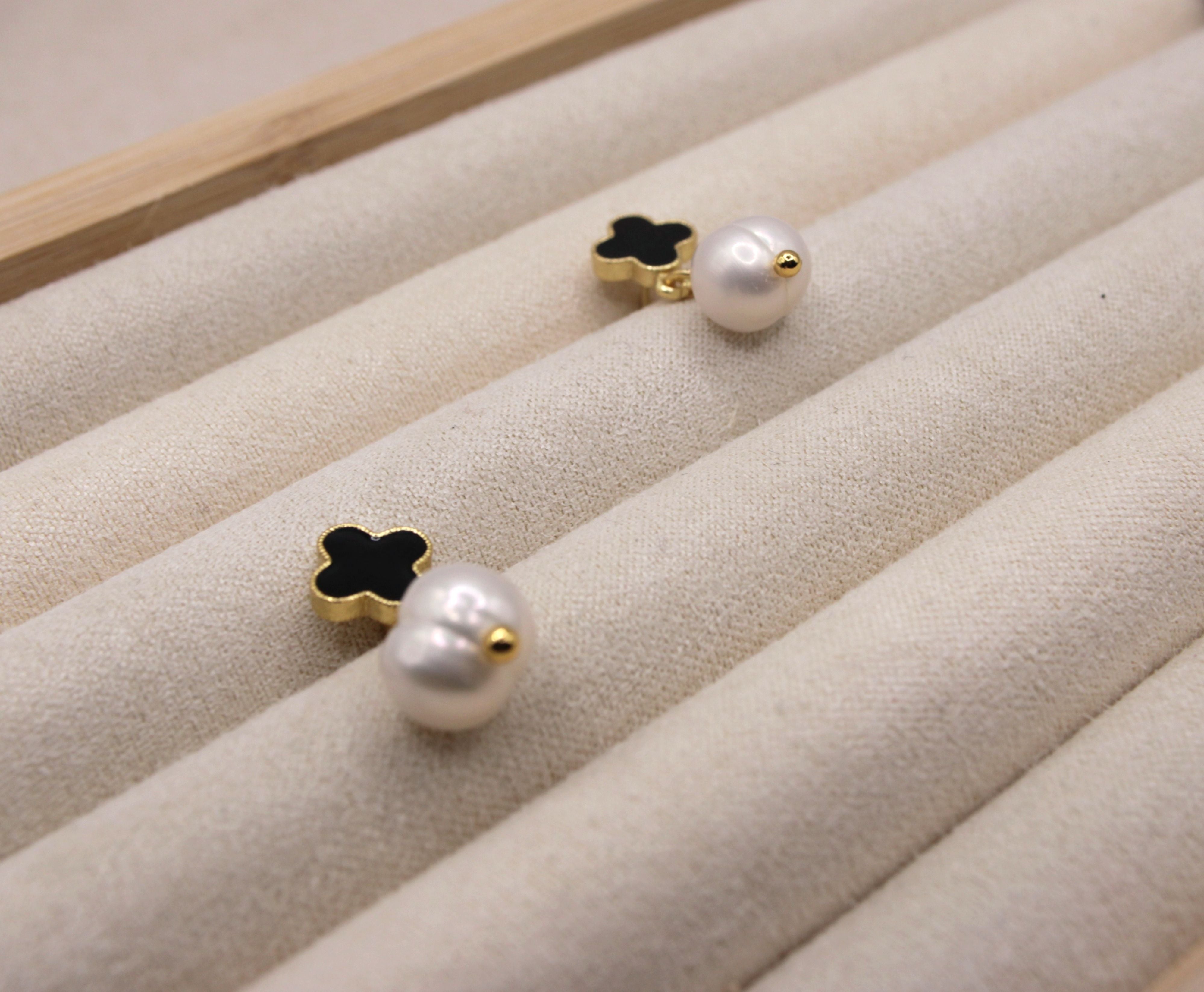 Gold-plated press-stud earrings featuring a black clover motif paired with a mother of pearl drop for a refined, timeless look. Lightweight and comfortable, this elegant design blends classic charm with modern style, making it perfect for both everyday wear and special occasions.