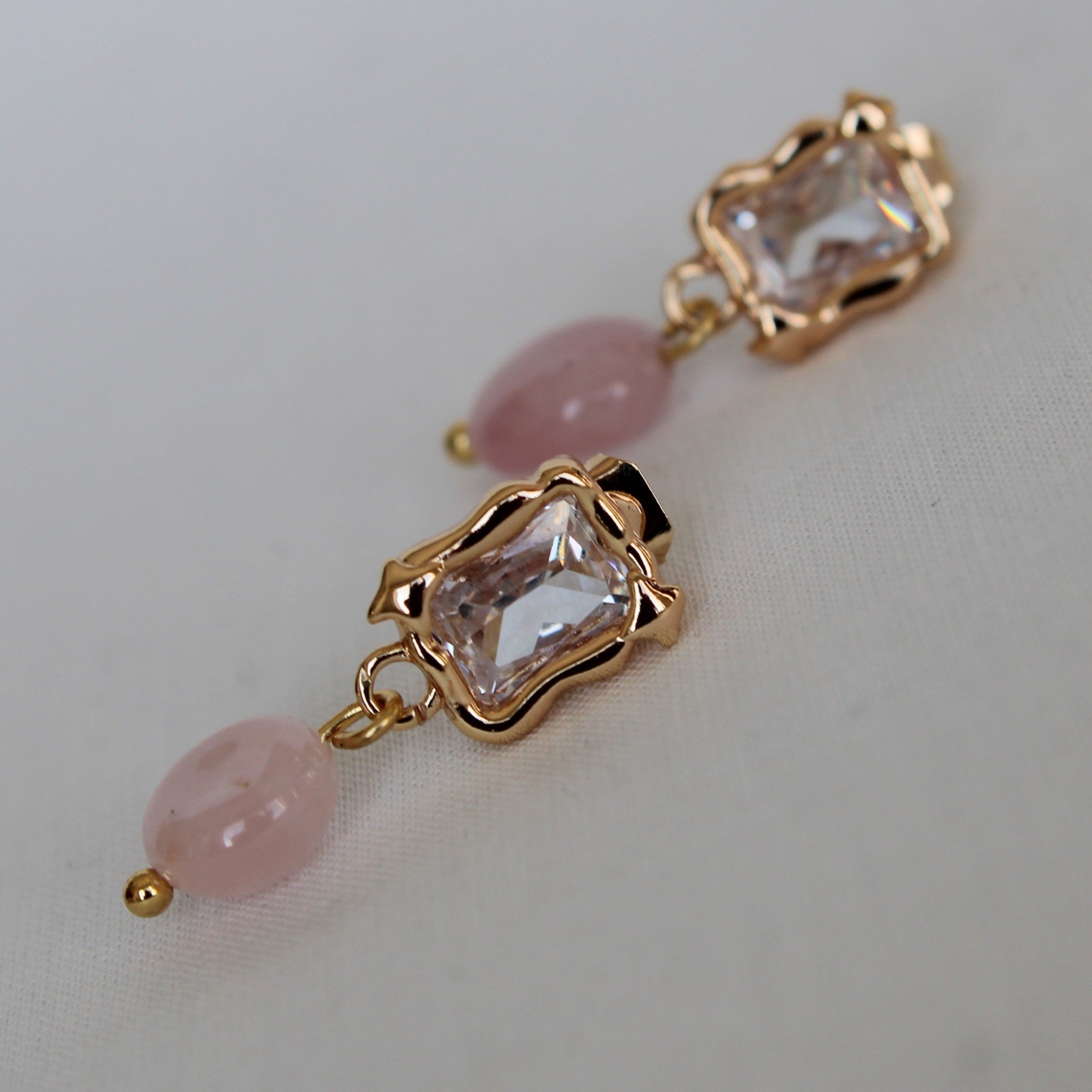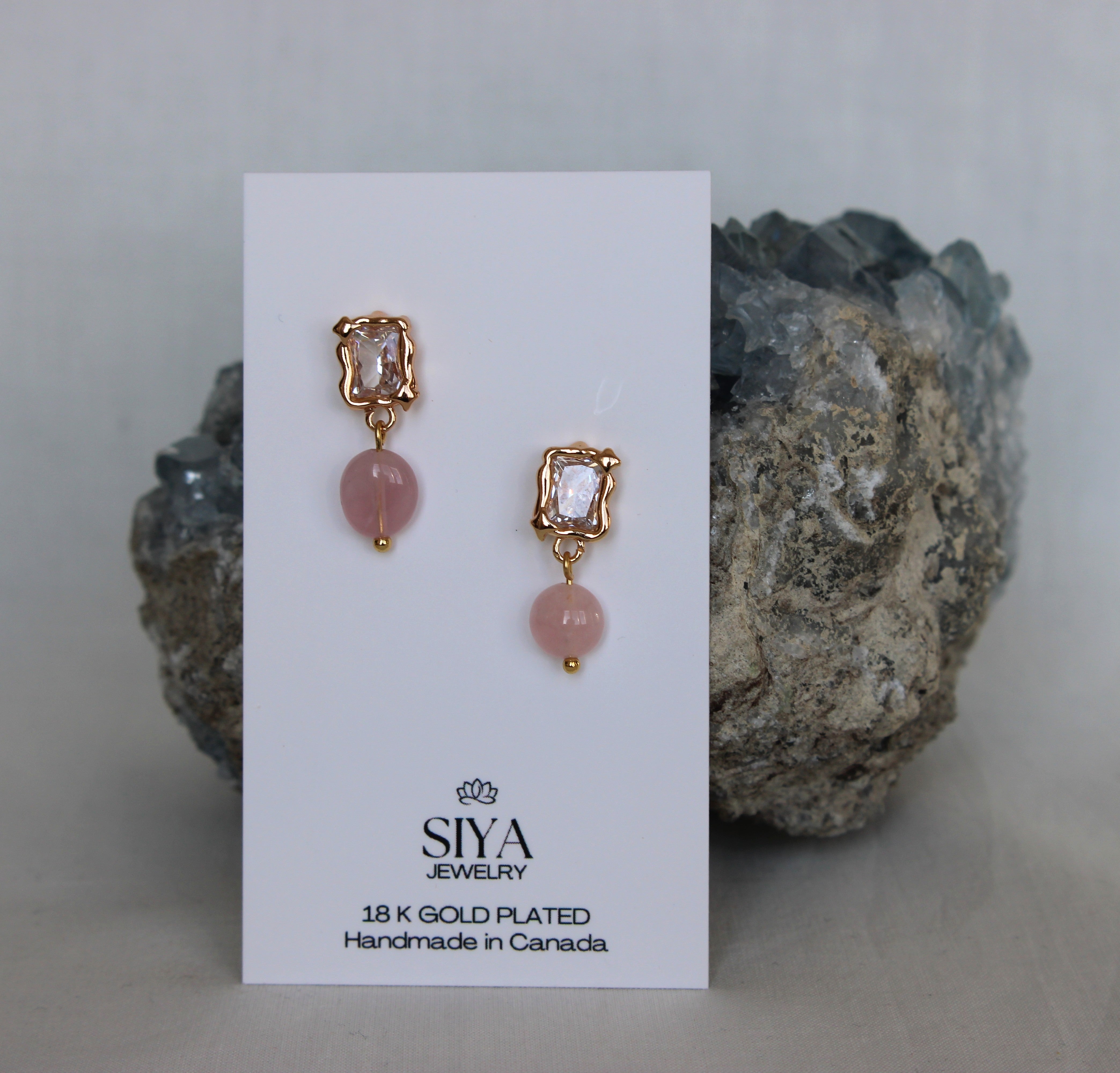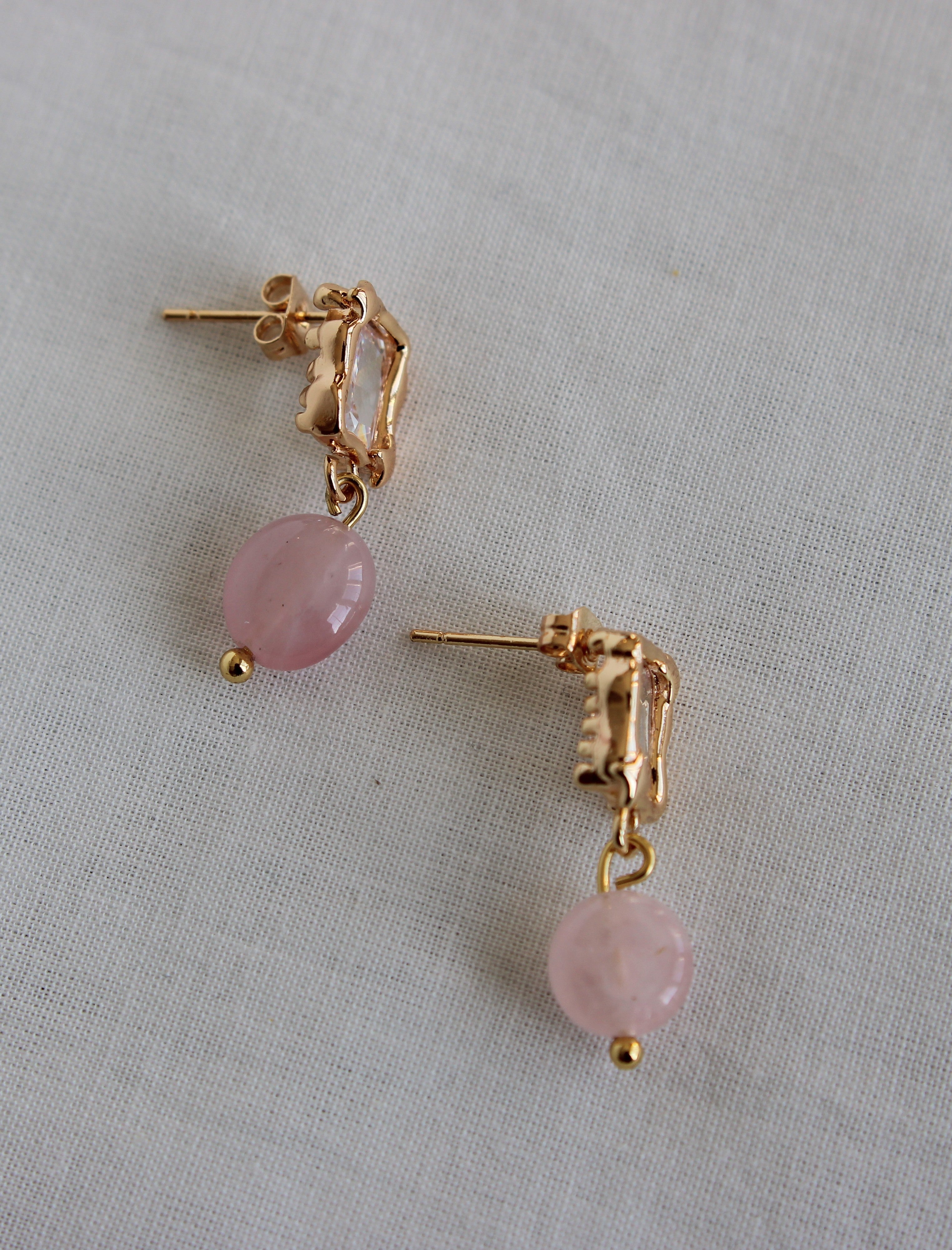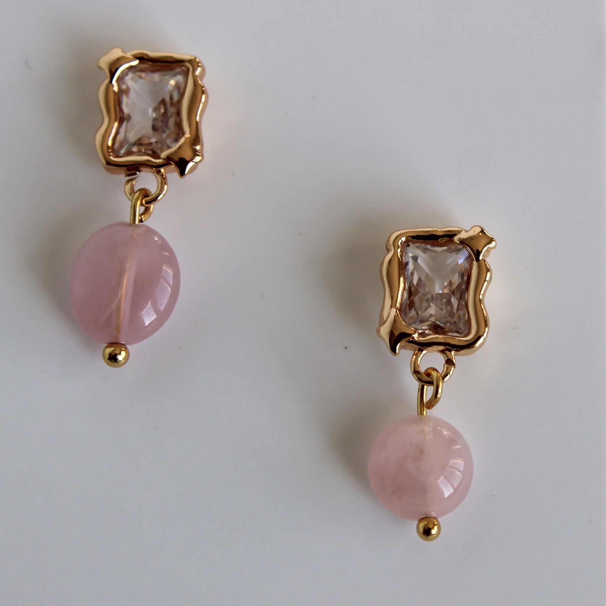 Add a playful flair to your look with gold-plated earrings featuring a rose quartz mini drop with secure push-back nuts for all-day wear. Lightweight and elegant, they add a subtle touch of sophistication to any outfit while keeping your ears happy.